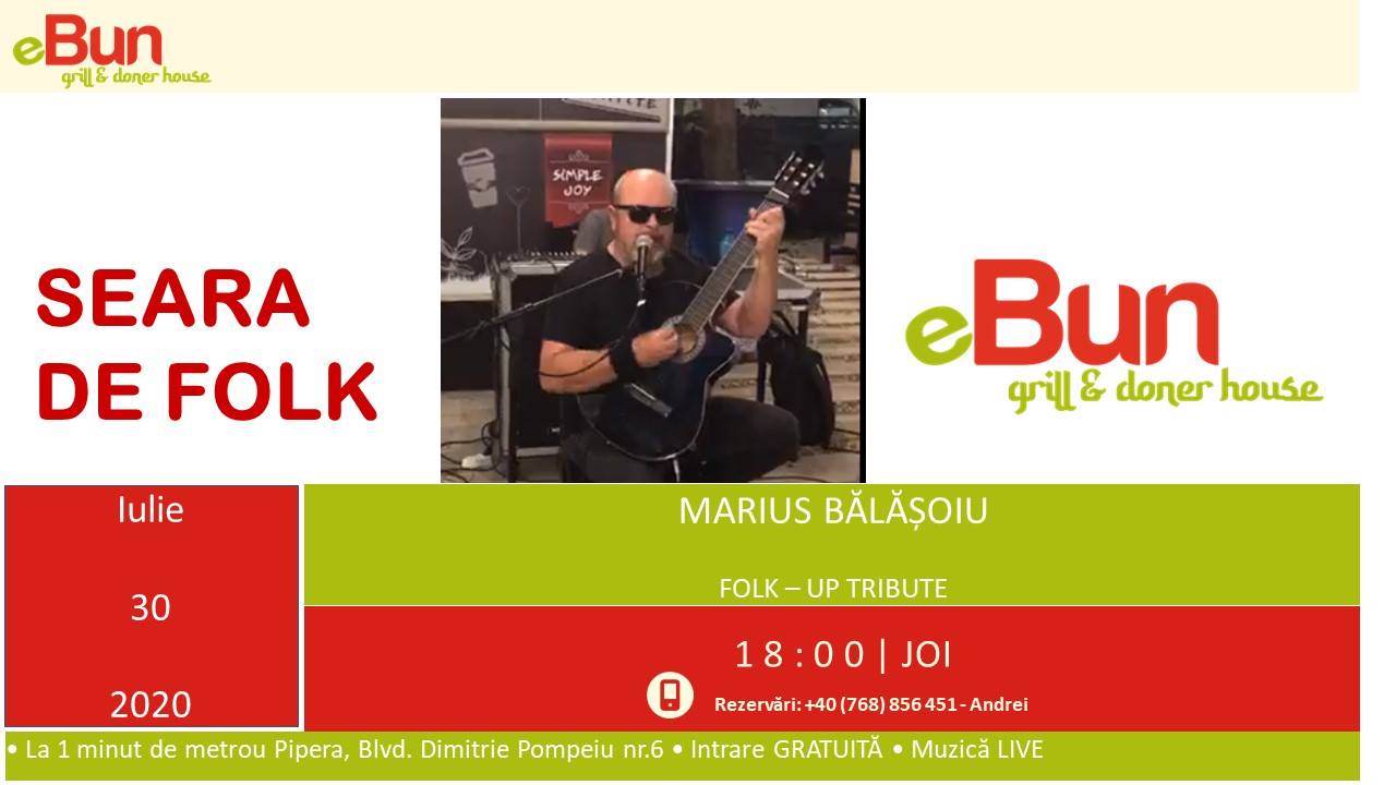 Joi 30 Iulie la ora 18:00 veți putea reasculta melodii folk din vremea Cenaclului Flacara la Terasa Ebun Doner, chiar langa statia de metrou Pipera, in interpretarea lui Marius Balasoiu.