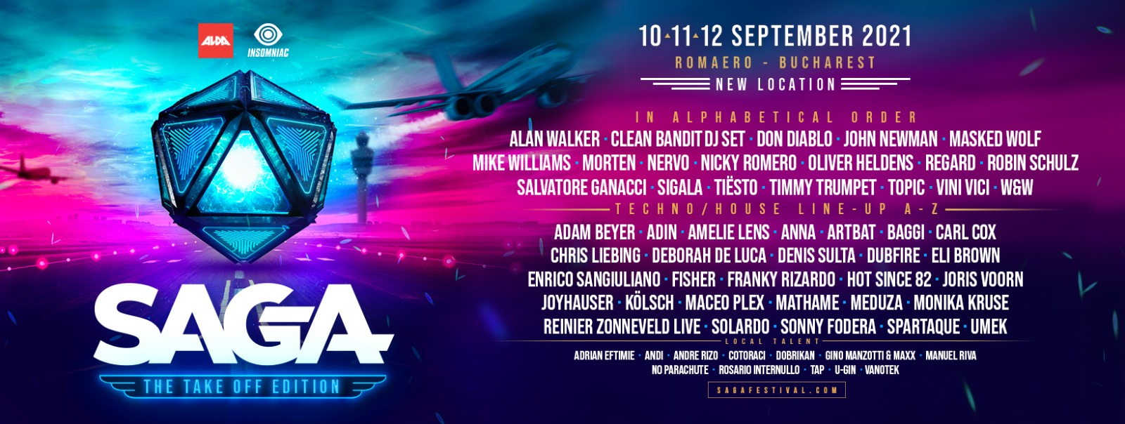 SAGA va aduce, în septembrie, o serie de show-uri spectaculoase, super efecte pirotehnice, design-uri extraordinare, un concept unic în România și un line-up format din unii dintre cei mai buni artiști ai muzicii electronice din lume precum Tiësto, Carl Cox, Alan Walker, Masked Wolf, Sickick, Nicky Romero, Oliver Heldens, Robin Schulz și mulți alții.