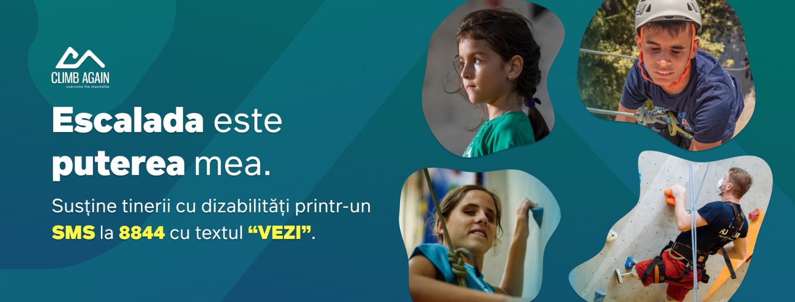 Escalada este puterea Arianei și a altor zeci de copii cu diferite tipuri de dizabilități. Dacă vrei să ajuți, donează 2 euro prin SMS la numărul 8844 cu textul VEZI sau orice altă sumă pe site-ul https://www.climbagain.ro/cum-poți-ajuta-tu !