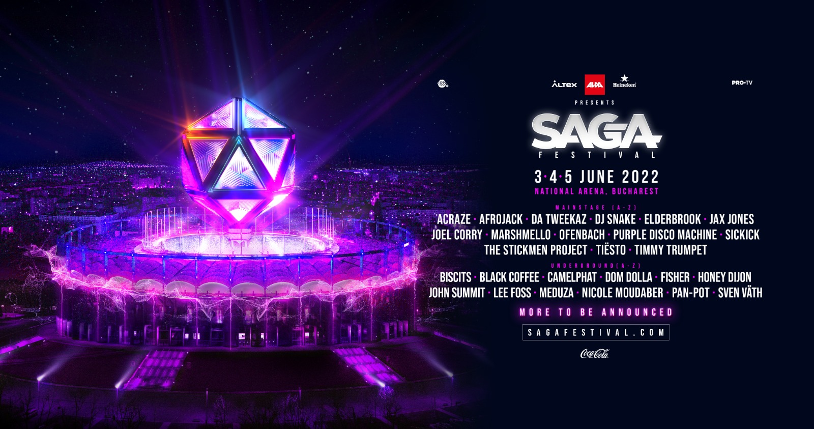 Pe 3, 4 și 5 iunie, la Național Arena, SAGA va aduce la București peste 200 de artiști internaționali și locali de renume și foarte multe surprize pentru festivalieri. Un concept uluitor, unic în România, multe scene și secrete așteaptă să fie aflate și să-i bucure pe toți cei dornici să le descopere.