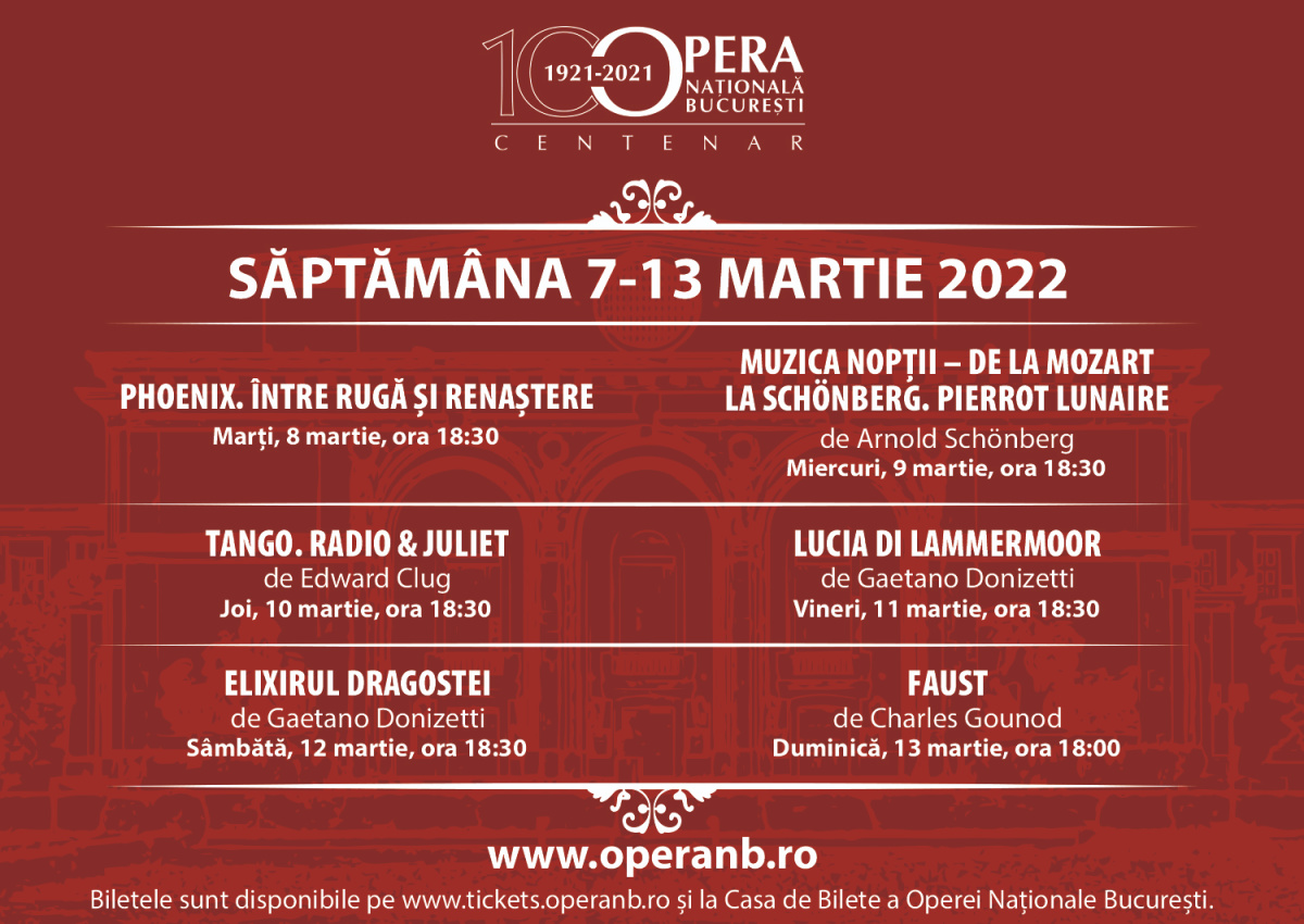 Între rugă și renaștere”, spectacolele de operă „Lucia di Lammermoor” de Donizetti, „Elixirul dragostei” de Donizetti, „Faust” de Gounod și spectacolul de coupé de dans contemporan „Tango. Radio & Juliet” de Edward Clug, toate făcând parte din repertoriul actual al operei bucureștene.
