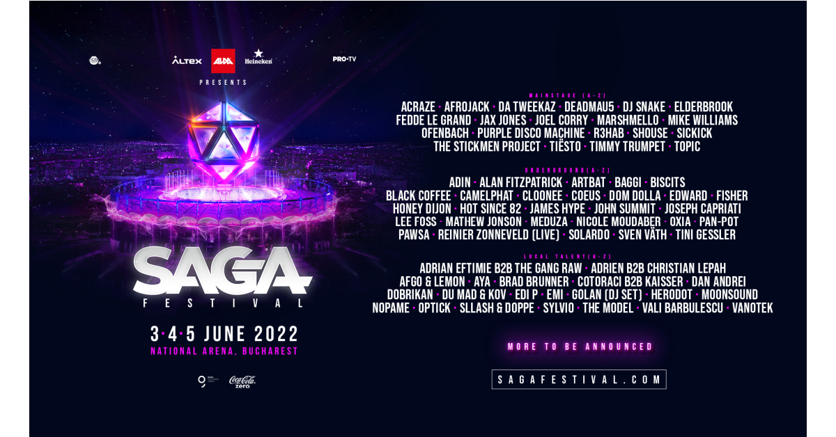 SAGA anunță noi artiști în line-up-ul celei de-a doua ediții a festivalului, care va avea loc în perioada 3-5 iunie, la Arena Națională. Deadmau5, Fedde Le Grand, R3HAB, Shouse, Alan Fitzpatrick, Artbat, Coeus, James Hype, Joseph Capriati, Oxia și Reinier Zonneveld se numără printre DJii care vor veni la începutul verii la București cu show-uri explozive.