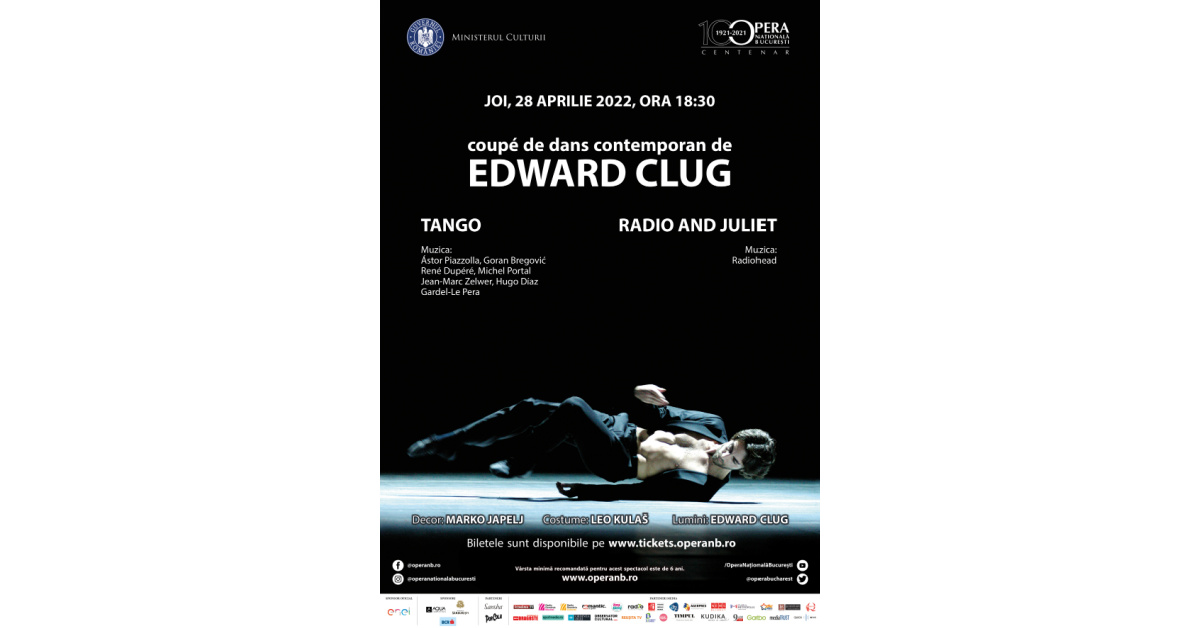 Joi, 28 aprilie, ora 18:30, vă invităm la „Tango. Radio & Juliet” , spectacol coupé de dans contemporan de Edward Clug. „Tango. Radio and Juliet” este un spectacol ce unește două coregrafii create de Edward Clug – artist de origine română stabilit în Slovenia – în care se regăsesc elemente de teatru și dans contemporan și fragmente muzicale extrem de diverse ca gen – de la Astor Piazzolla și până la Goran Bregovic și Radiohead. Tangoul, unul dintre cele mai pasionale dansuri din lume, și eternii îndrăgostiți Romeo și Julieta se întâlnesc astfel, într-un mod inedit, în spectacolul „Tango. Radio and Juliet” pentru a da viață celor mai puternice și contradictorii stări: pasiune, iubire, deziluzie, singurătate. Încă de la începutul secolului al XX-lea și, în mo deosebit, în perioada interbelică, tango-ul ca dans și chiar gen muzical a fost foarte cultivat în societatea românească devenind chiar un dans emblematic al muzicalității și eleganței partenerilor, prilej de spontane pasiuni noi ori de consolidarea celor vechi. Confidența emotivă, culturală și mondenă cu tango-ul a continuat în societatea românească și în secolul nostru ceea ce explică succesul de public al acestui spectacol.