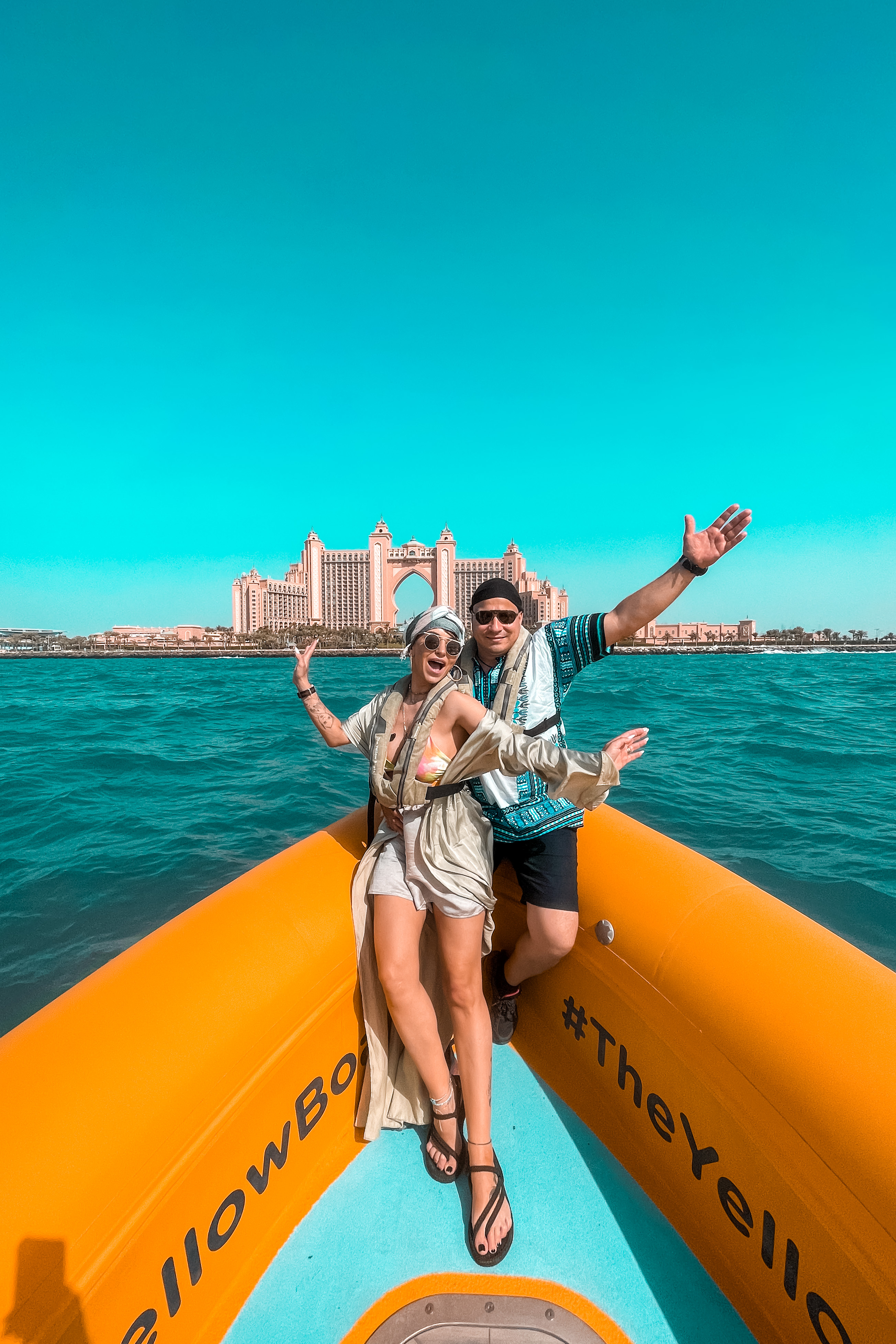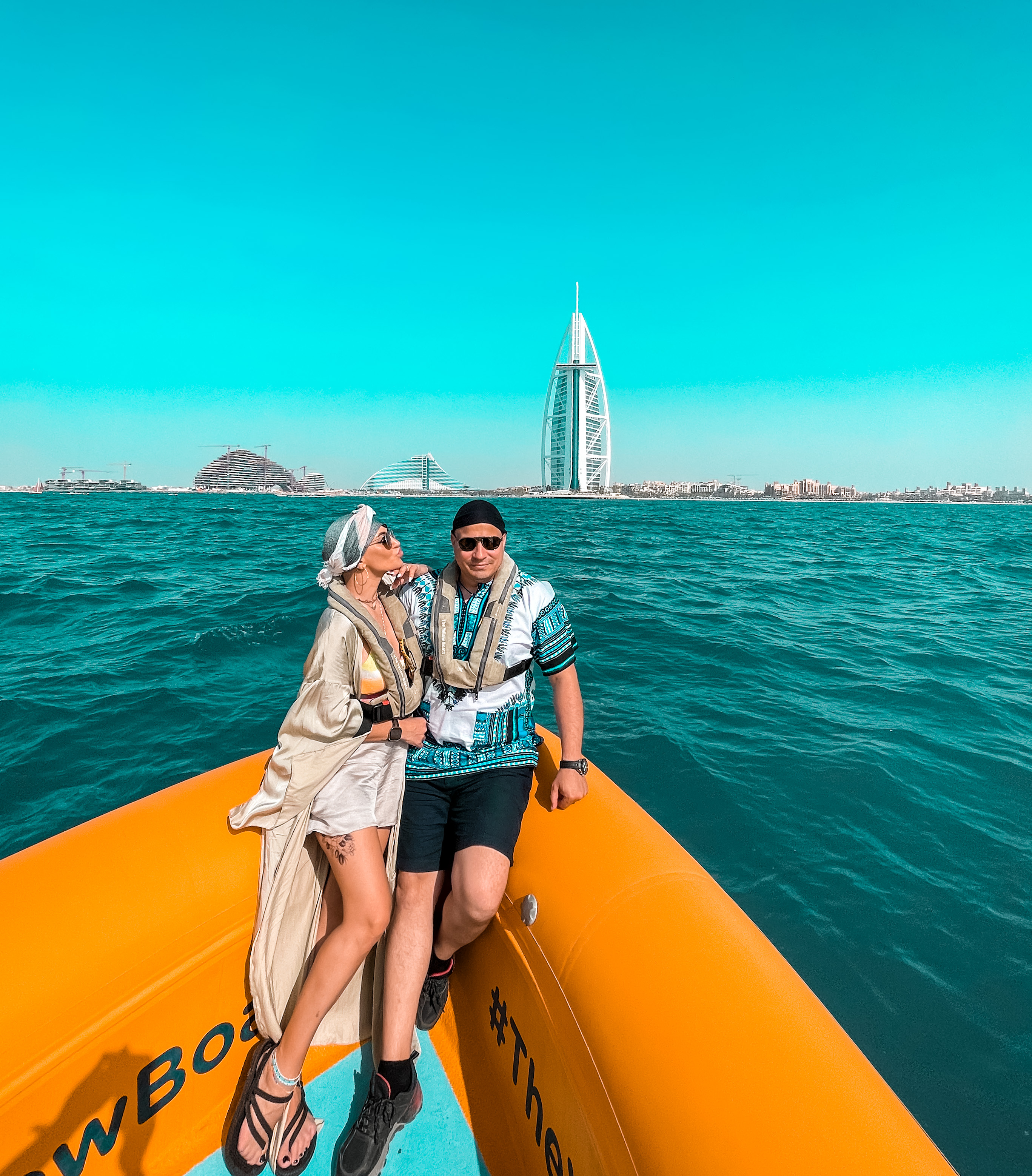 Pasionați de bărci și croaziere, Giulia și Vlad nu puteau rata experiența Yellow Boats Dubai. Plecând din Dubai Marina, la maximum speed într-una dintre cele mai sigure bărci pneumatice de viteză din lume, cei doi au avut parte de distracție și adrenalină. Iar opririle pentru poze nu puteau fi decât în fața unor locuri emblematice precum Burj Al Arab și Atalntis The Palm.