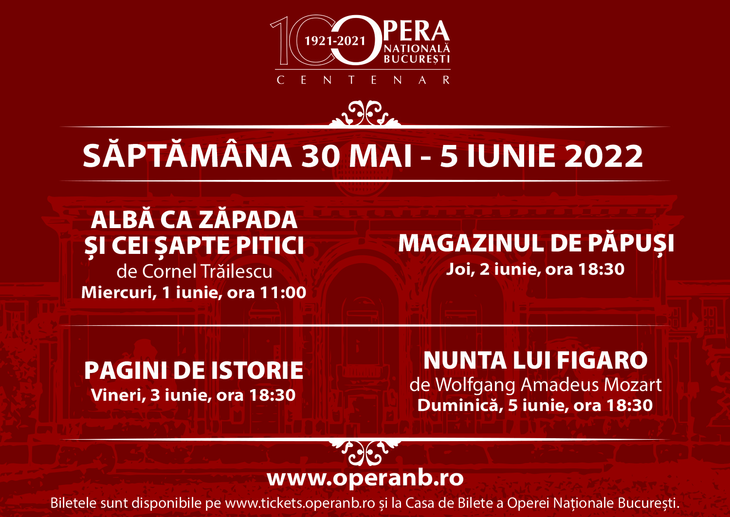 Opera Națională București prezintă săptămâna viitoare spectacolele de balet pentru copii „Albă ca zăpada și cei șapte pitici” de Cornel Trăilescu și „Magazinul de păpuși” cu ocazia Zilei Internaționale a Copilului și spectacolul cu opera „Nunta lui Figaro” de Wolfgang Amadeus Mozart.