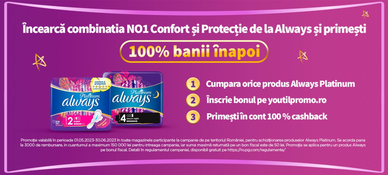 Prin intermediul campaniei ”Always Platinum Cashback”, Always, primul brand care a introdus absorbantele igienice în România, îți oferă nu doar oportunitatea de a te bucura de confort și protecție pe perioada menstruației, ci și oportunitatea de a primi 100% banii înapoi pentru pentru fiecare pachet Always Platinum cumpărat.