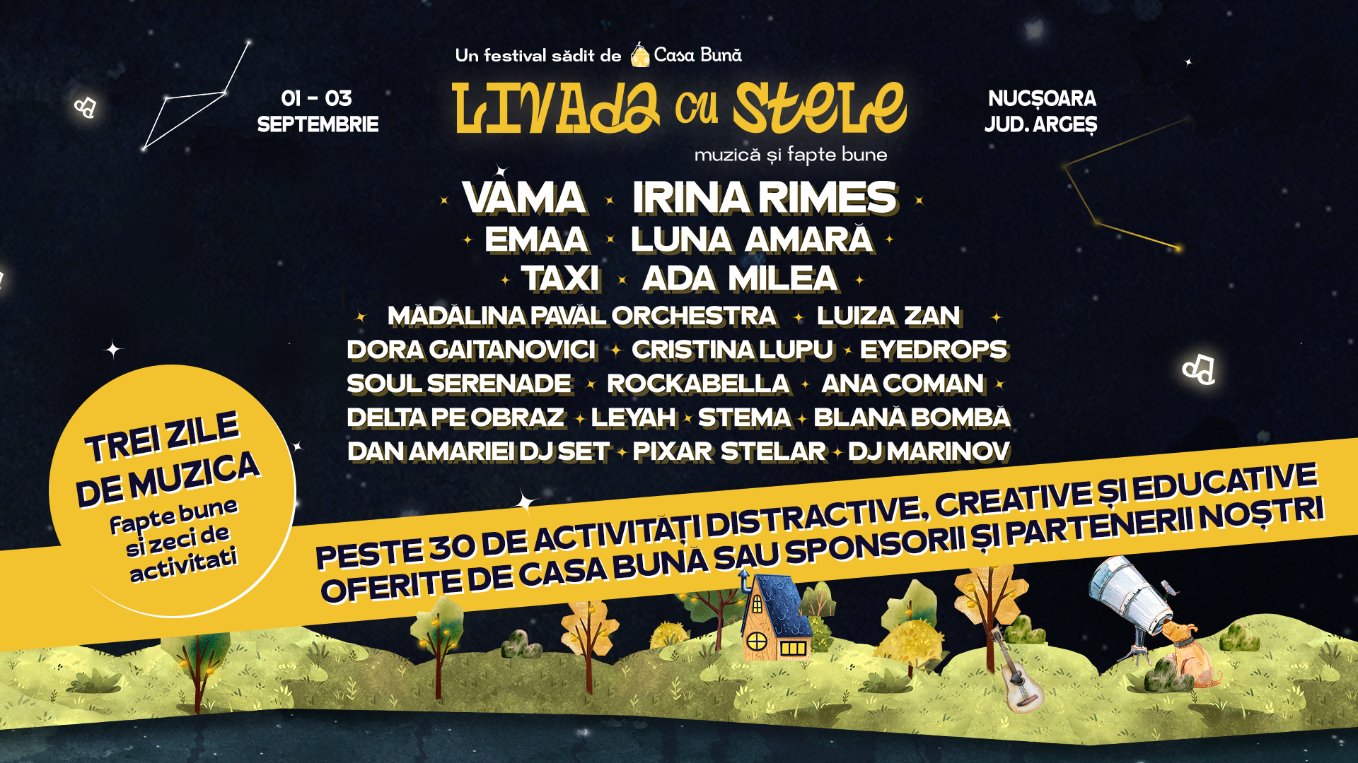 Asociația Casa Bună anunță programul pe zile al activităților din cadrul primei ediții a festivalului caritabil „Livada cu stele”, ce va avea loc în perioada 1-3 septembrie la Nucșoara, județul Argeș.