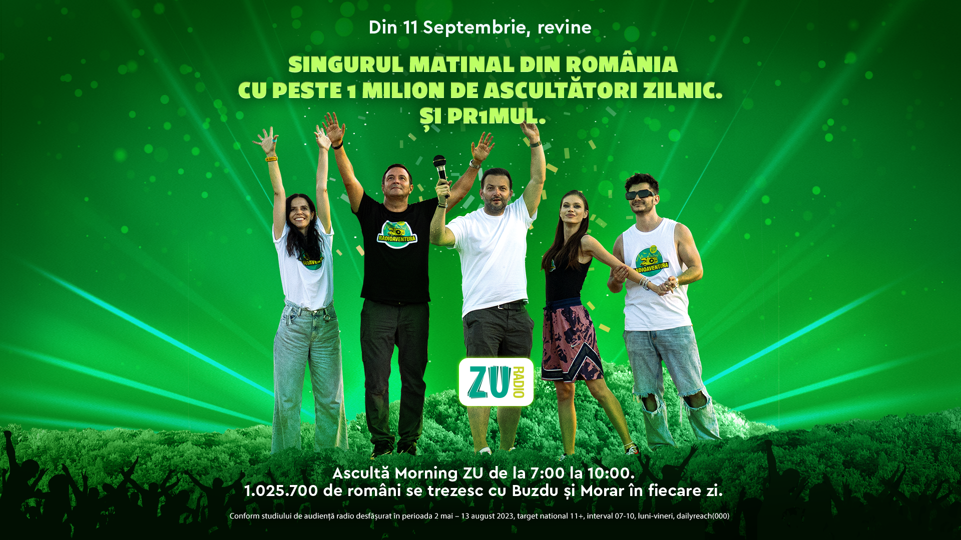 Din 11 septembrie, revine #MorningZU - singurul matinal din România cu peste 1 milion de ascultători zilnic. Un alt mod de a spune „Te iubesc”: 1.025.700 de români se trezesc cu Buzdu și Morar în fiecare zi, de la 7.00 la 10.00.