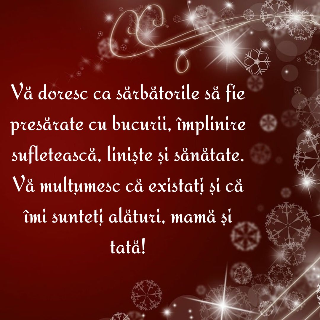 Vă doresc ca sărbătorile să fie presărate cu bucurii, împlinire sufletească, liniște și sănătate. Vă mulțumesc că existați și că îmi sunteți alături, mamă și tată!