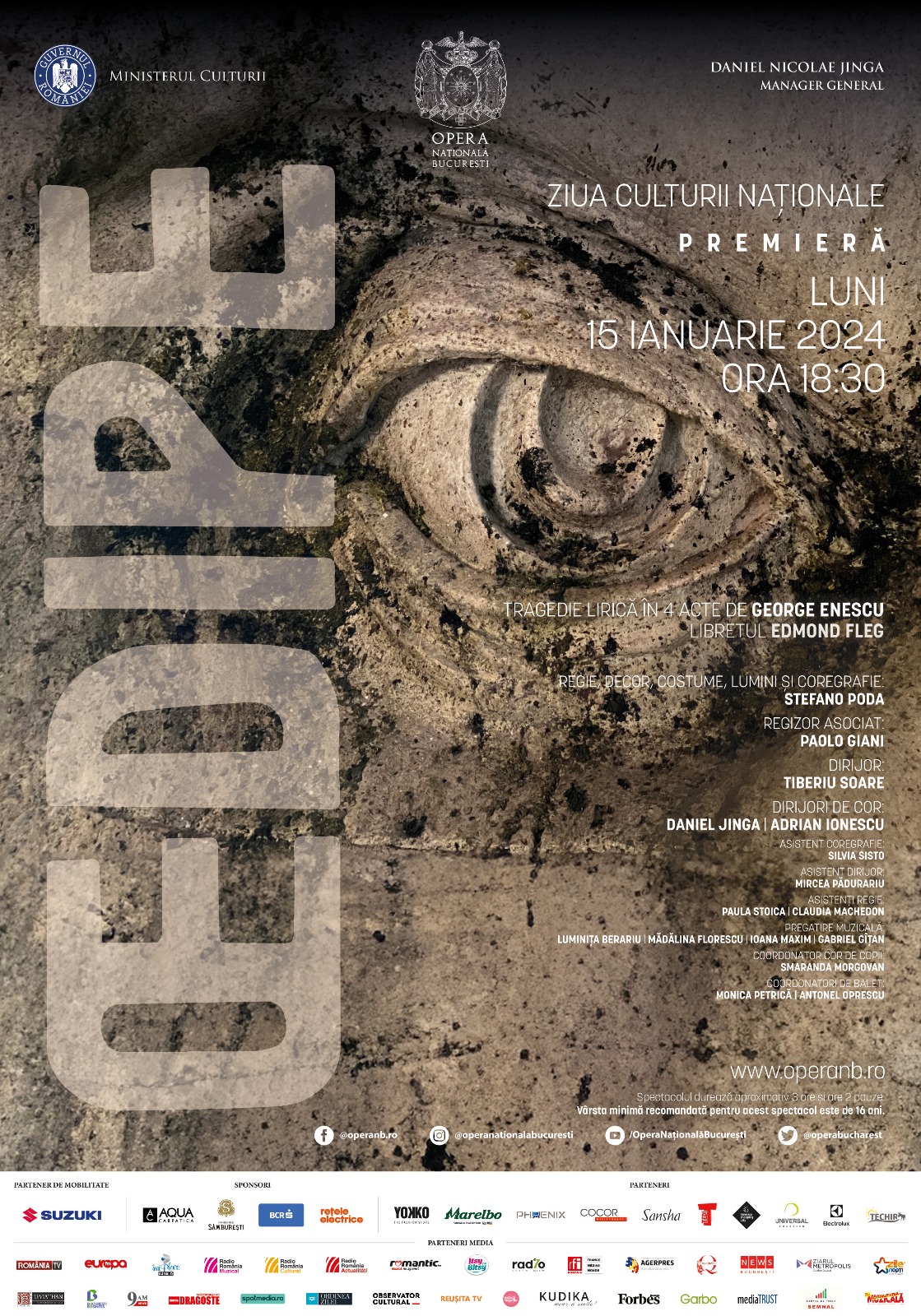 Luni, 15 ianuarie, ora 18:30, Opera Națională București prezintă premiera capodoperei Oedipe de George Enescu, cu prilejul Zilei Culturii Naționale. Regia, decorul, costumele, luminile și coregrafia poartă semnătura lui Stefano Poda. La pupitrul dirijoral se va afla maestrul Tiberiu Soare.