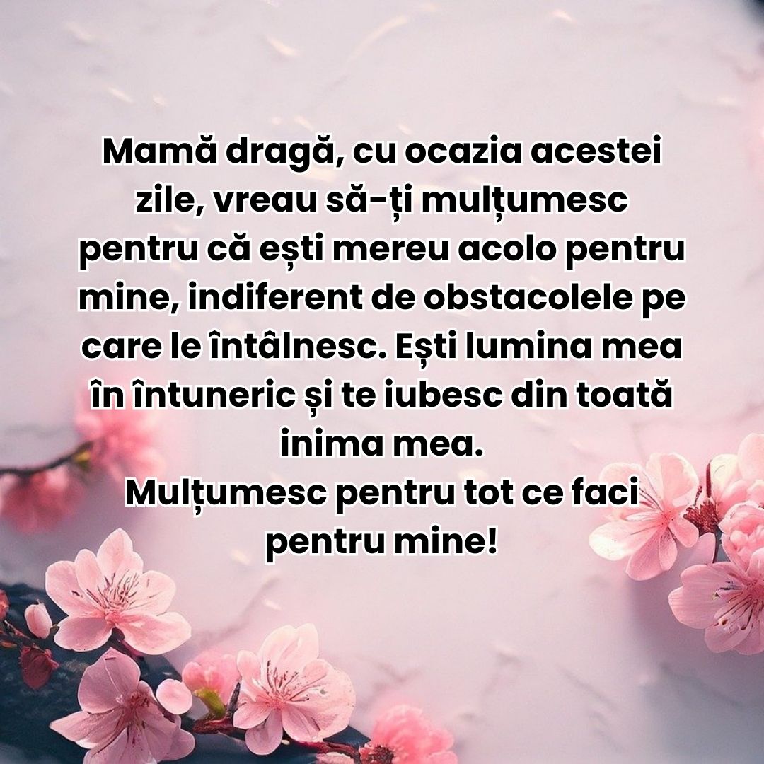 „Mama dragă, cu ocazia acestei zile, vreau să-ți mulțumesc pentru că ești mereu acolo pentru mine, indiferent de obstacolele pe care le întâlnesc. Ești lumina mea în întuneric și te iubesc din toată inima mea. Mulțumesc pentru tot ce faci pentru mine!”