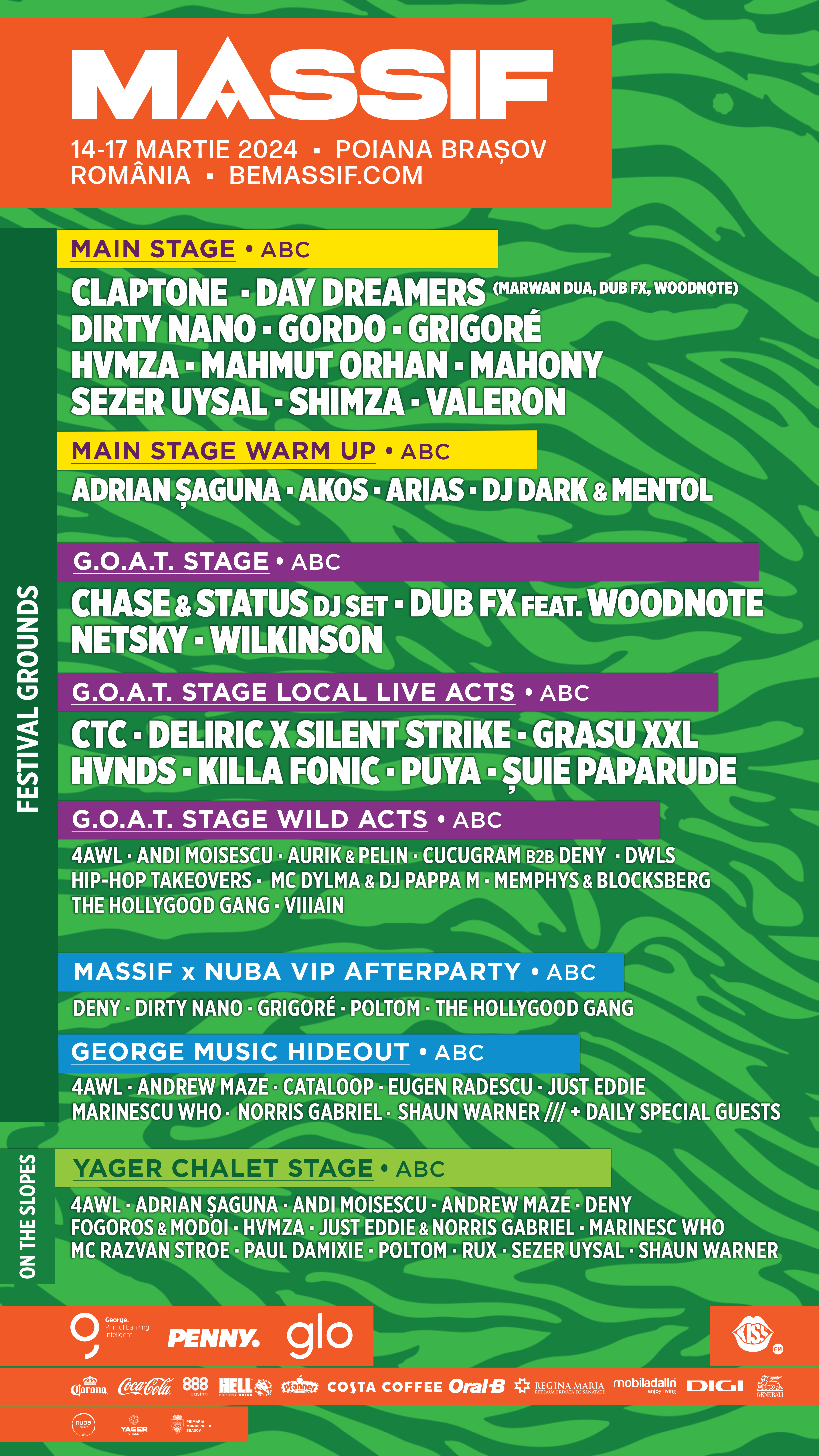 În Poiana Brașov, în perioada 14-17 martie, fanii se vor bucura de cele mai tari petreceri alături de artiștii prezenți în festival pe scena principală, G.O.A.T. (Greatest Of All Time), Massif x Nuba VIP Afterparty, George Music Hideout și la apres-ski-urile partenere, Nuba Chalet Stage și Yager Chalet Stage.