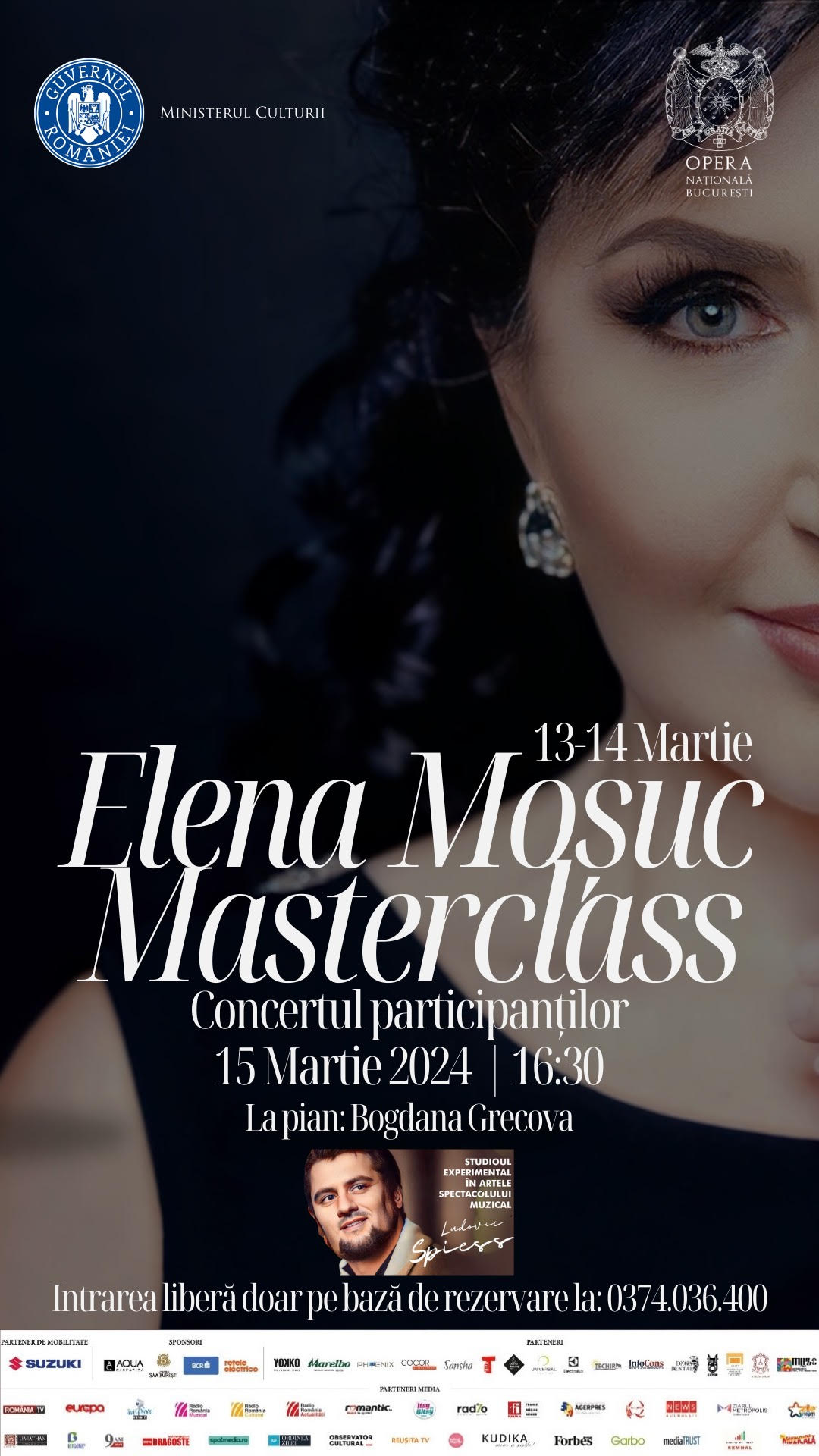 Vineri, 15 martie, ora 18:30, Opera Națională București vă așteaptă la un veritabil concert masterclass susținut de marea soprană Elena Moșuc. Recunoscută drept una dintre cele mai versatile şi mai expresive soprane ale perioadei contemporane, cu o carieră internaţională de peste trei decenii, soprana Elena Moșuc se bucură de un succes deplin pe cele mai mari scene de operă ale lumii. Vă invităm, așadar, să participați la un eveniment muzical extraordinar în care soprana de renume mondial Elena Moșuc – acompaniată la pian de Bogdana Grecova – va împărtăși tainele belcantoului cu tânara generație de artiști lirici. Evenimentul va avea loc în Foaierul Galben al Operei Naționale București. Intrarea este liberă, în limita locurilor disponibile, doar pe bază de rezervare la numerele de telefon 0743.069.630 sau 0374.030.137.