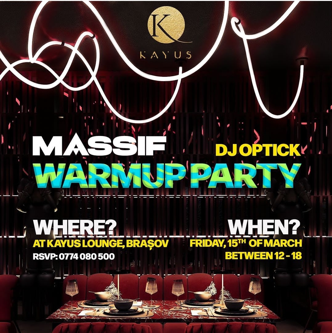 „Îmi face o deosebită plăcere să anunț cea mai tare colaborare dintre Massif și Kayus Lounge. Vineri, 15 martie, la Kayus Lounge organizez cel mai tare party din istoria Brașovului. Invitat special este DJ Optick, care va da startul warmup-ului între 12:00 și 18:00, pentru ca mai apoi să ne mutăm cu toții în Poiana Brașov să ne distrăm, să ne bucurăm, să cântăm și să petrecem. Mai am ceva foarte important de transmis: biletele sunt în număr limitat, așa că cel mai bine ar fi să fie achiziționate din timp.”, declară antreprenorul Caius Covrig.