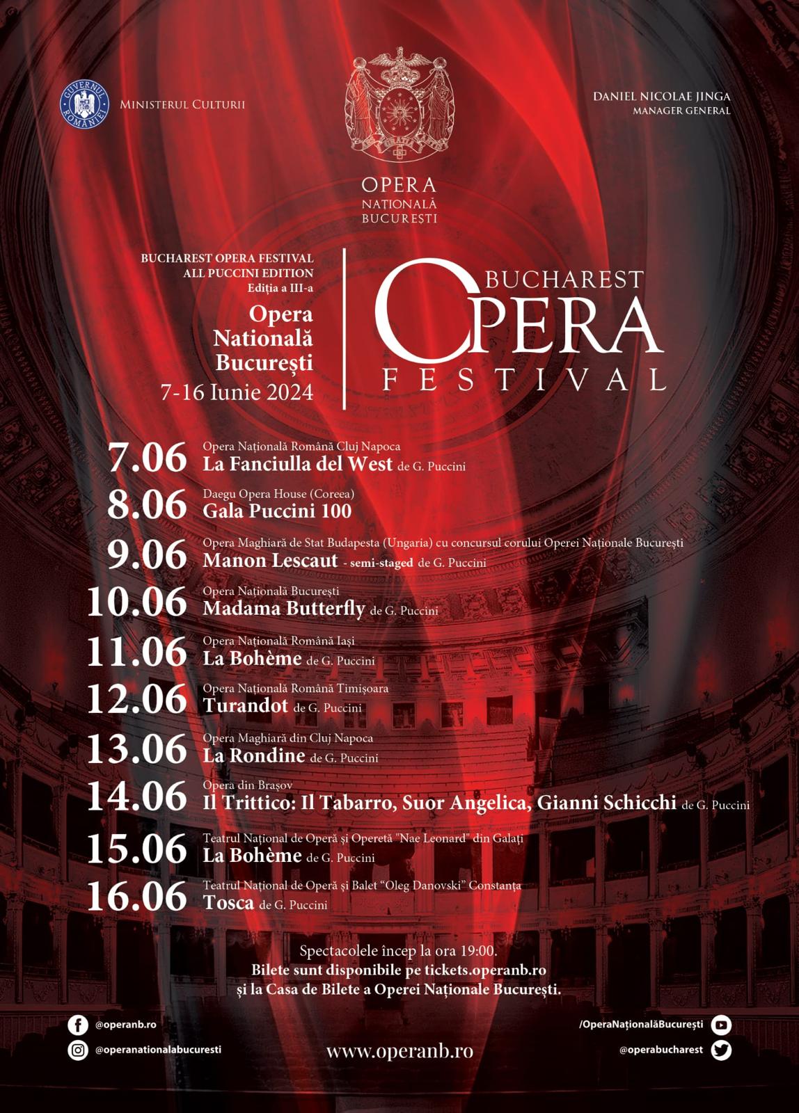 Bucharest Opera Festival – All Puccini Edition are pe afiş în cele 10 seri de festival, nu mai puţin de 8 producţii din creația marelui compozitor, un spectacol semi-staged, o gală de operă și 10 teatre: Opera Maghiară de Stat din Budapesta, Daegu Opera Festival din Coreea, Opera Națională Română Iaşi, Opera Naţională Română din Cluj Napoca, Opera Națională Română Timişoara, Opera Maghiară din Cluj-Napoca, Teatrul Național de Operă și Balet „Oleg Danovski” din Constanţa, Opera din Braşov, Teatrul de Operă şi Operetă „Nae Leonard” din Galaţi şi, bineînţeles, Opera Naţională din Bucureşti.
