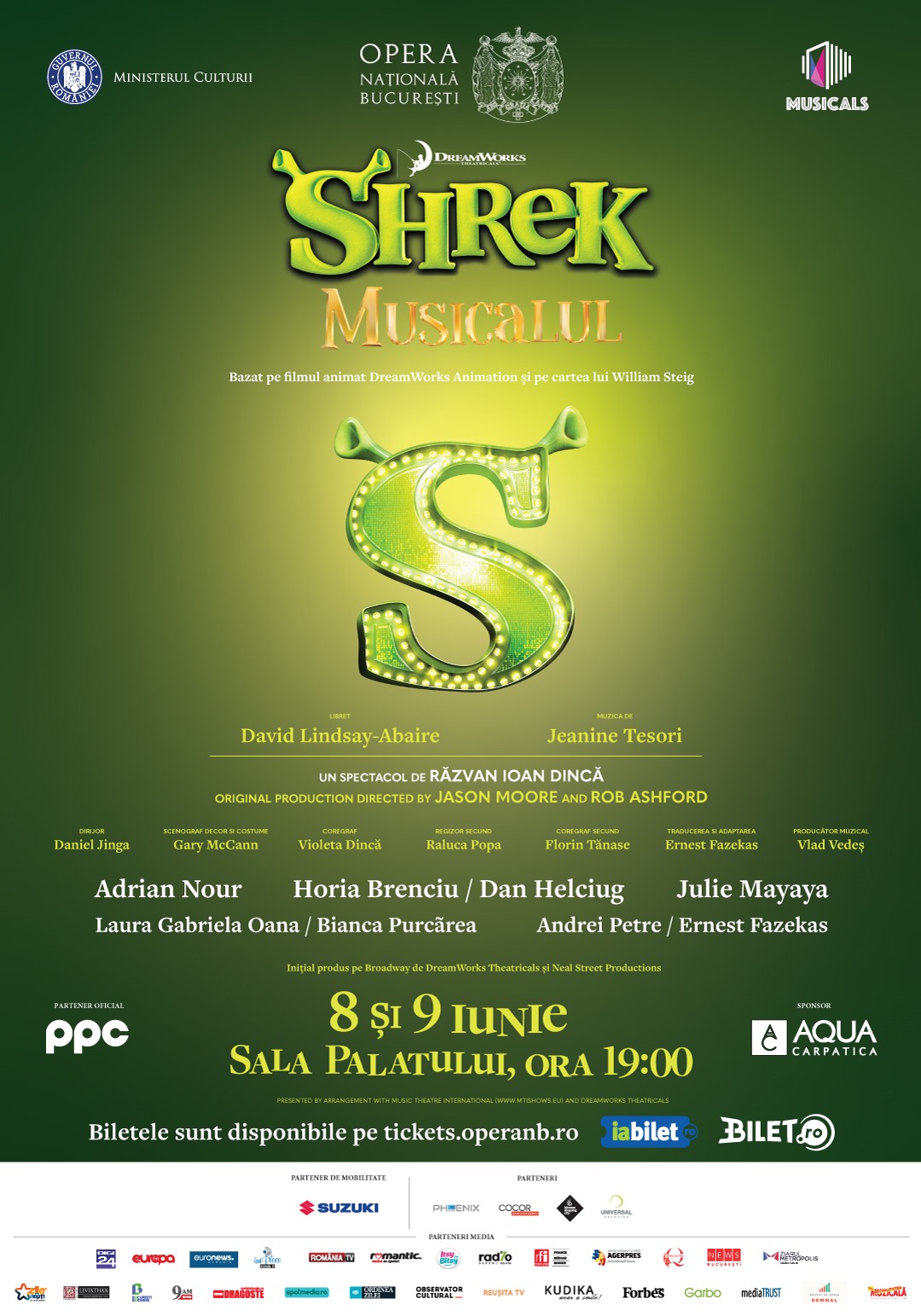 Repetițiile pentru Shrek, cel mai așteptat musical de anul acesta din România, sunt în toi. Zeci de artiști, în frunte cu o distribuție de excepție printre care Horia Brenciu și Dan Helciug (Shrek), Oana Laura Gabriela și Bianca Purcărea (Fiona), Adrian Nour (Măgărușul), Julie Mayaya (Dragonița), Andrei Petre și Ernest Fazekaș (Lord Farquuad) repetă zile și nopți la rând ca totul să iasă perfect pe 8 și 9 iunie la Sala Palatului, atunci când are loc premiera faimosului spectacol. Jucat inițial pe Broadway la New York, spectacolul din România este produs de Opera Națională București și Musicals.ro, aceeași echipă din spatele altor producții de succes precum “Fantoma de la Operă”, “Mamma Mia” și “My Fair Lady”.