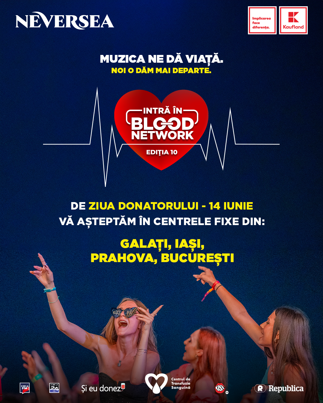 Blood Network, cea mai longevivă campanie de donare de sânge din România, marchează Ziua Donatorului printr-o acțiune specială care are loc în patru centre de transfuzie din țară: București, Galați, Ploiești și Iași. Astfel, cei care vor dona sânge în aceste centre pe 14 iunie vor primi abonament la Neversea. Donarea se face în limita capacității de recoltare.