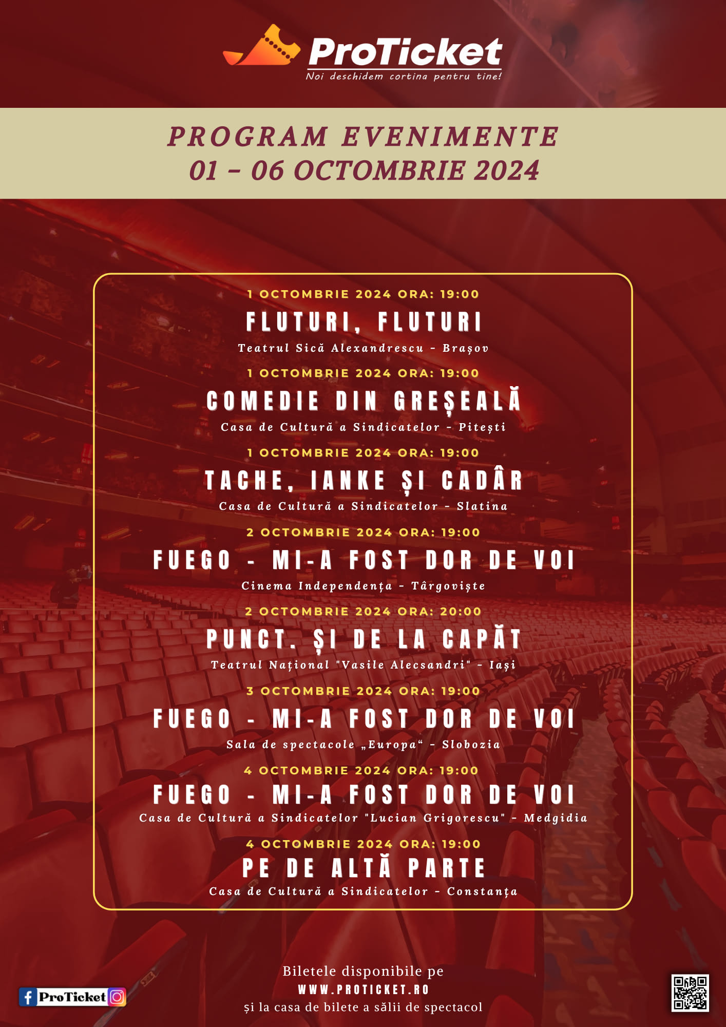 Bilete disponibile la toate spectacolele pe https://proticket.ro/.