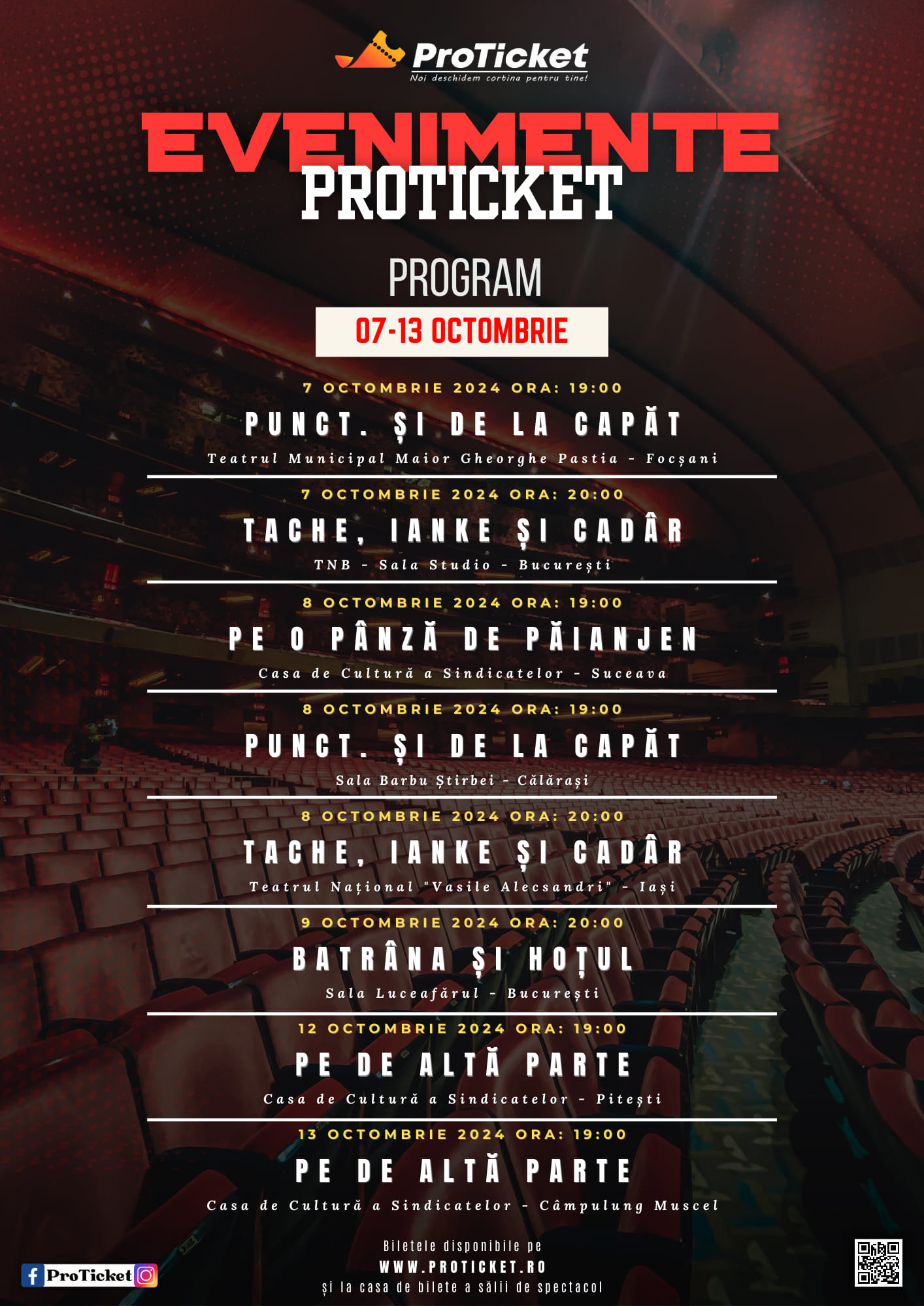ProTicket, cel mai mare producător de teatru privat din România, va aduce în cea de-a doua săptămâna a lunii octombrie spectacole de teatru precum „Take, Ianke și Cadâr”, „Pe o pânză de păianjen” și „Punct. Și de la capăt”.