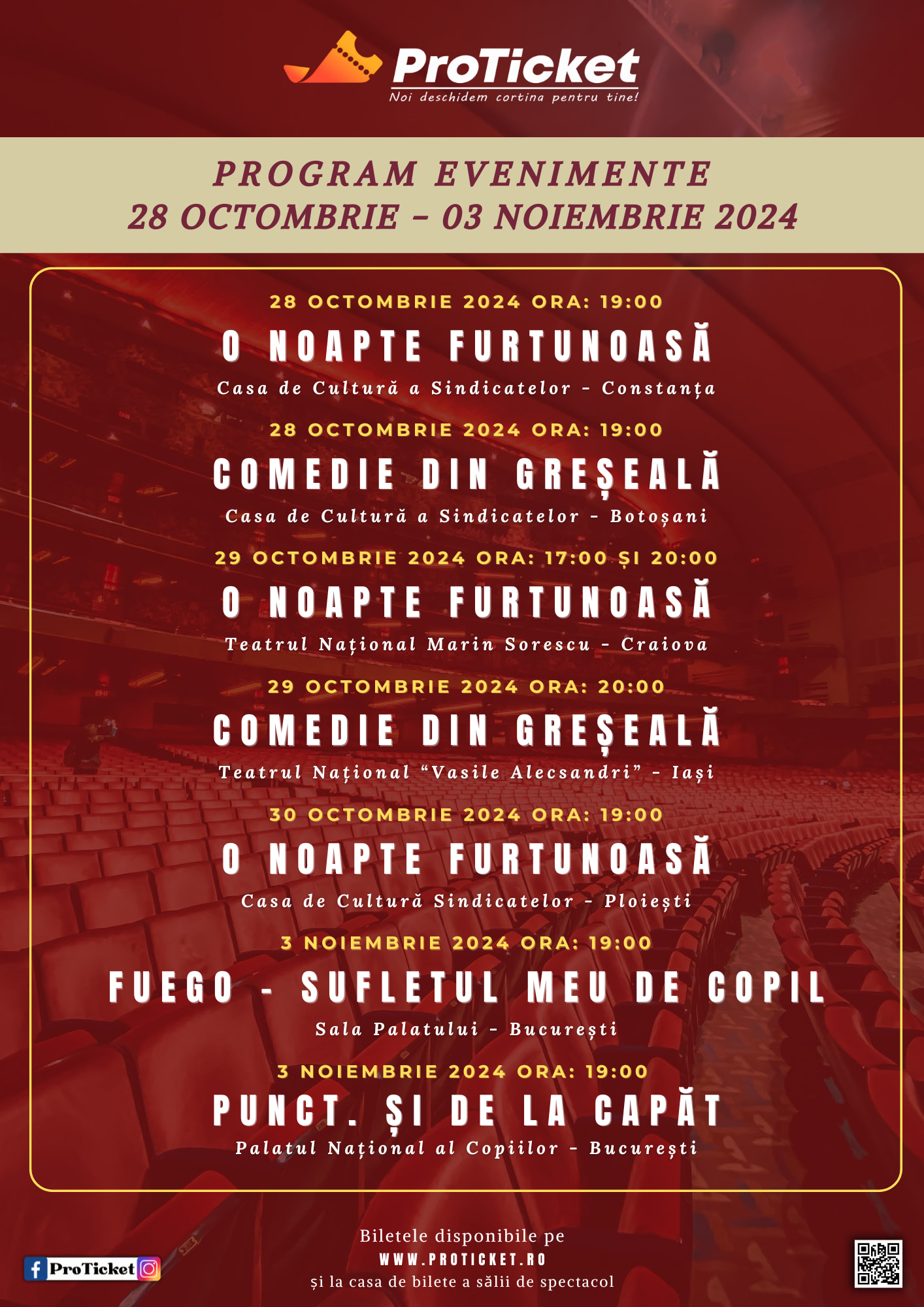 ProTicket, cel mai mare producător de teatru privat din România, pregătește pentru final de octombrie și început de noiembrie 2024 o serie de spectacole și concerte remarcabile, ce vor încânta publicul din București și Brașov. În centrul atenției se află concertul extraordinar „Fuego – Sufletul meu de copil” și spectacolele de teatru „O noapte furtunoasă”, „Comedie din greșeală” și „Punct. Și de la capăt”.