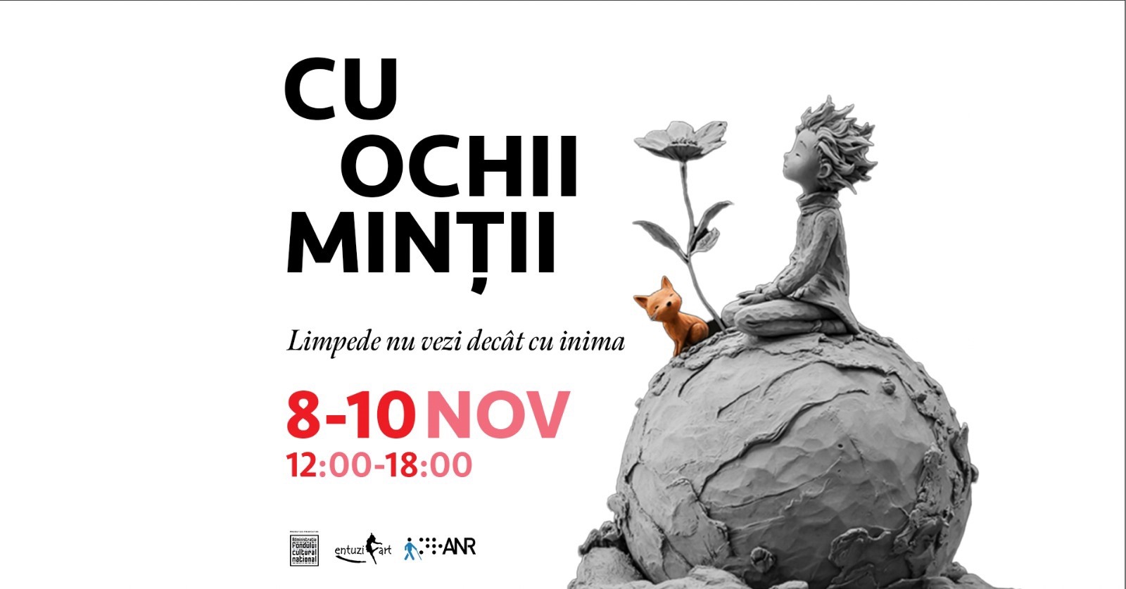(Descriere a imaginii asociate textului pentru persoanele nevazătoare) Imaginea prezintă un afiș cu titlul „Cu Ochii Minții”. Textul principal este urmat de o frază scrisă cu caractere mai mici: „Limpede nu vezi decât cu inima”, un citat faimos din „Micul Prinț”. În partea de jos a afișului sunt menționate datele „8-10 Nov”, indicând perioada evenimentului, și intervalul orar „12:00-18:00”.
