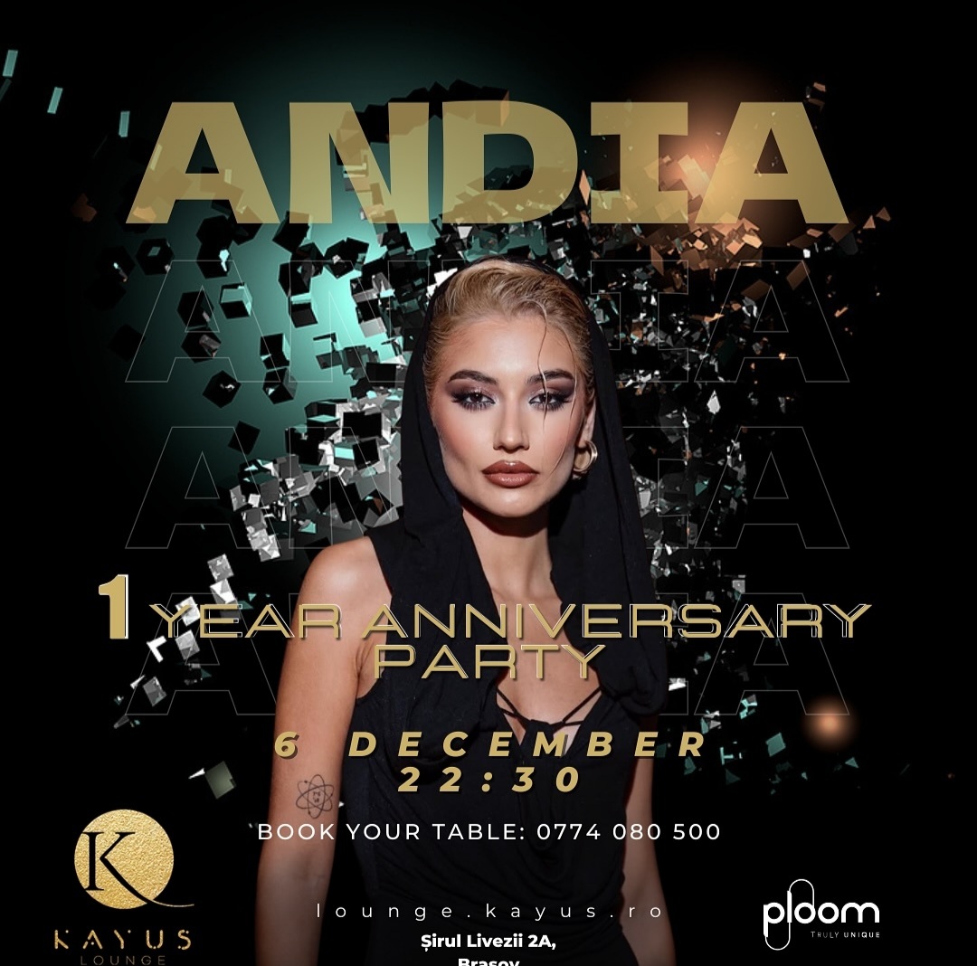 Ziua de 6 decembrie se anunță una plină de surprize. Caius Covrig, antreprenorul de succes de la noi, celebrează 1 an de la deschiderea Kayus Lounge Brașov, cea mai exclusivistă locație de tip restaurant & lounge de la poalele Tâmpei. Și pentru că seara va fi una de sărbătoare, afaceristul a pregătit totul la superlativ pentru oaspeții lui, cu invitați pe măsură. Cel mai așteptat moment este cel al artistei Andia, care va concerta și încânta, pe toți cei aflați în locație, cu hiturile ei binecunoscute.