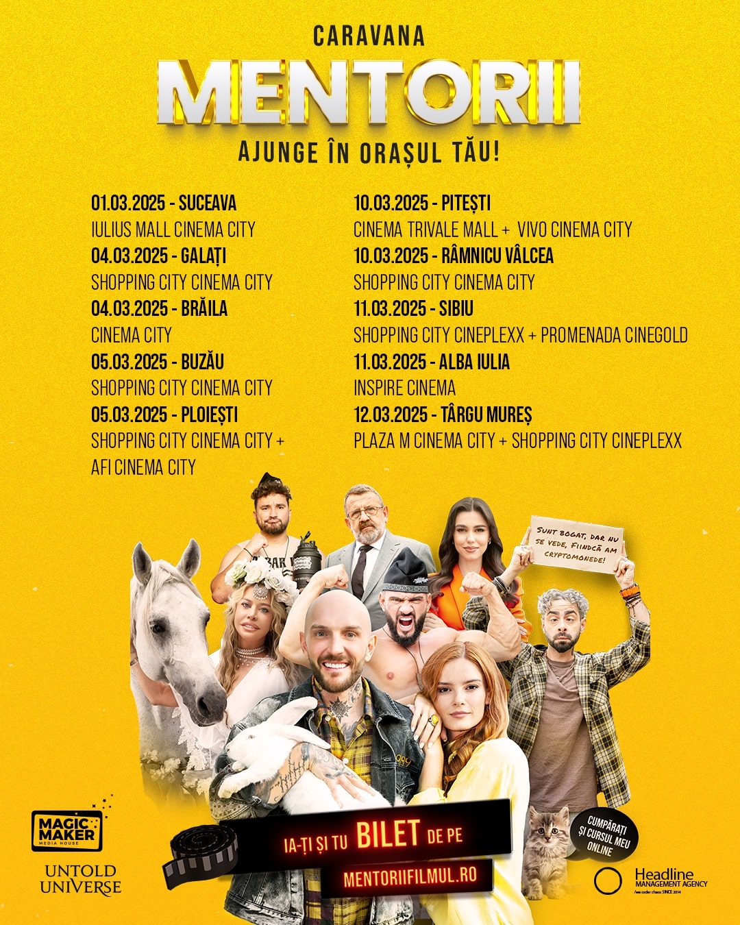 Datorită entuziasmului impresionant al publicului, caravana MENTORII continuă și ajunge în încă zece orașe din România. Succesul fabulos al proiecțiilor speciale de avanpremieră i-a determinat pe producători să prelungească turneul de promovare și să aducă filmul și echipa mai aproape de și mai mulți spectatori. Este o ocazie unică pentru publicul din aceste orașe să se bucure de cea mai tare experiență de cinema și să îi întâlnească pe unii dintre cei mai îndrăgiți actori din distribuție, dar și pe creatorii acestui film și să afle de la ei cele mai amuzante întâmplări de pe platourile de filmare. MENTORII, comedia savuroasă care garantează hohote de râs, poate fi vizionată în cinematografele din toată țara începând de astăzi, 28 februarie.