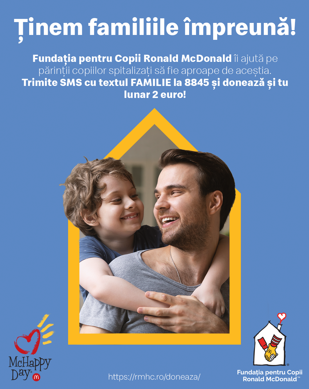 Fundația pentru Copii Roland McDonald a lansat o nouă campanie de strângere de fonduri. Și tu poți dărui nopți de cazare gratuită, sprijin și timp împreună familiilor care au copiii internați pentru tratamente îndelungate. Astfel, poți dona în mod recurent suma de 2 Euro/lună printr-un SMS la 8845 cu textul FAMILIE. De asemenea, pe site-ul fundației, www.rmhc.ro/doneaza, poți alege să faci o donație lunară.