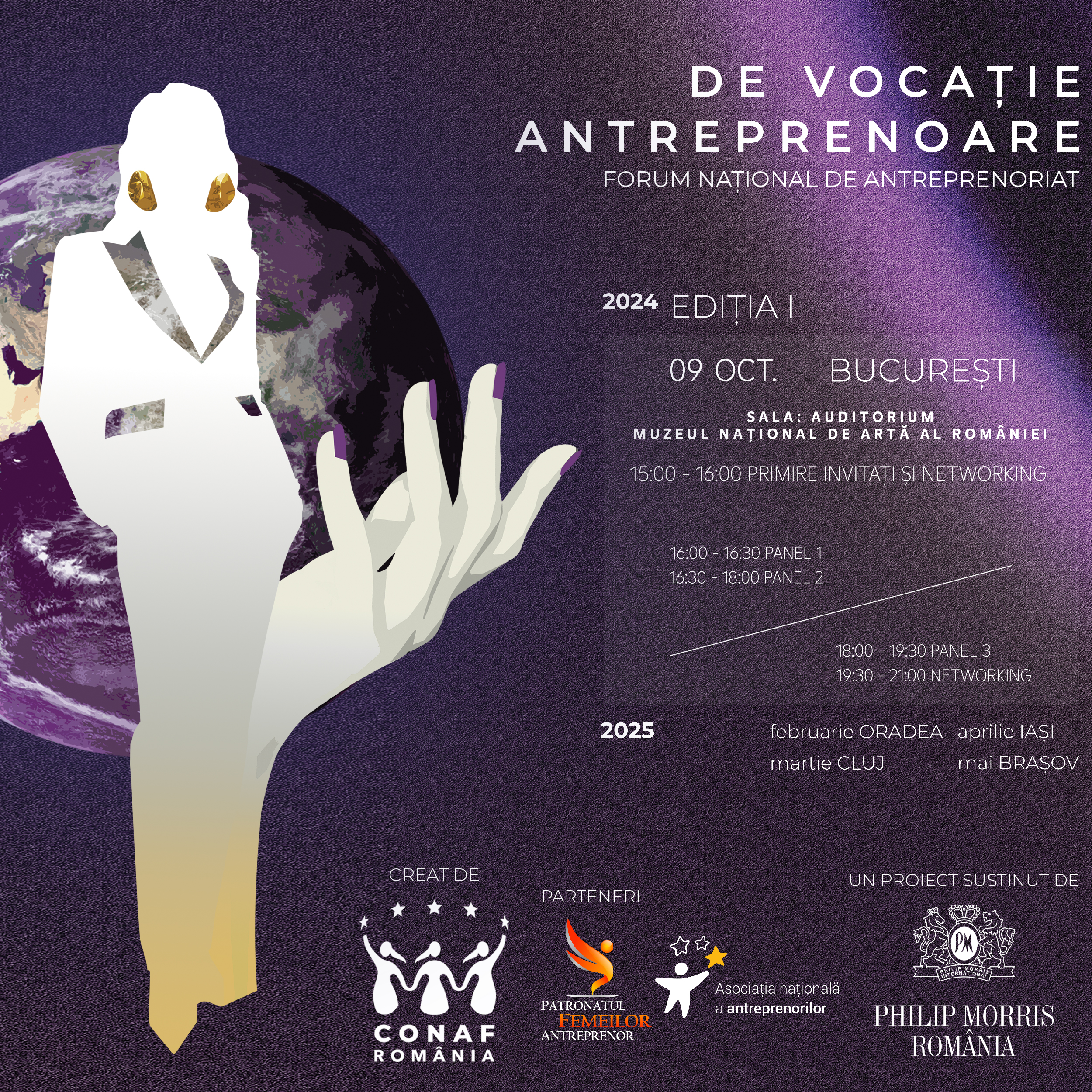 CONAF vă invită la Forumul "De Vocație Antreprenoare" – locul unde visele antreprenoriale prind contur și viitorul este creat prin curaj, pasiune și solidaritate, prima și cea mai amplă inițiativă de gen, unde vocația, curajul și pasiunea se întâlnesc pentru a inspira și susține antreprenoriatul feminin. CONAF își propune să micșoreze decalajul inițiativelor între femei și bărbați în România, sprijinind antreprenorii de astăzi pentru a-și descoperi și valorifica întregul potențial.