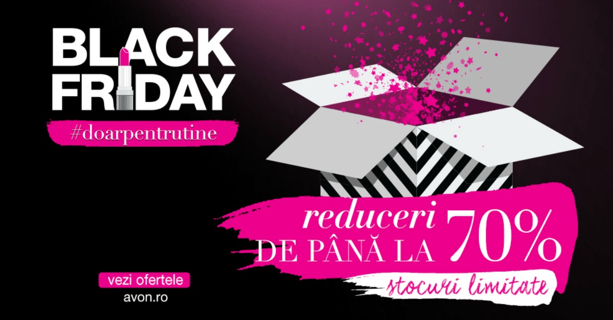 AVON a dat startul campaniei de Black Friday si vine cu peste 60 de oferte pentru produse din toate categoriile portofoliului sau: Parfumuri, Machiaj, Fashion, Ingrijirea Corpului, Ingrijirea Parului si Ingrijirea Tenului.