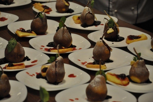 Mod de preparare:Perele se scobesc si se introduce branza, apoi se pune la cuptor la o temperatura de 225° C timp de 6 min. Intre timp se pune zaharul la topit pana se formeaza un caramel.