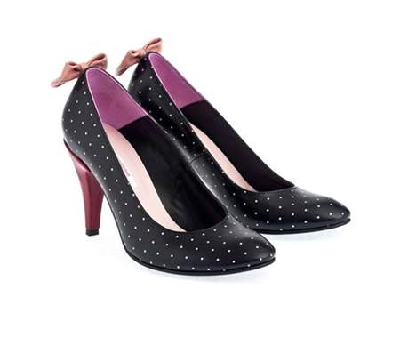 Pantofi negri cu buline mici albe, imprimate pe toata suprafata materialului. Pantofii au un accent decoratic feminin si elegant, o funda in contrast pastel, roz, montata pe spatele pantofului, deasupra calcaiului. Tocul este un alt element de efect, datorita culorii sale puternice.
