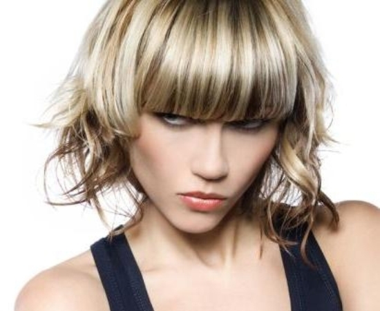 Aceasta coafura pentru parul mediu impleteste un breton tuns la aceeasi lungime si perfect intins, cu restul parului tuns asimetric in incretit inspre varfuri.
