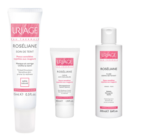 Gama ROSELIANE a Laboratoarelor Dermatologice Uriage iti ofera 3 actiuni esentiale in 3 produse pentru ingrijirea tenului cu roseata, eritroza, cuperoza, rozacee sau post interventii cu laser vascular: descongestioneaza, stimuleaza microcirculatia, hidrateaza tenul gratie extractului de Ginseng, sulfatului de dextran, apei termale Uriage, complexului inovator Cerasterol-2F.