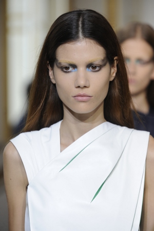 Look-ul vechilor modele de la Hollywood este inca fascinant, iar muzele care l-au inspirat pe John Galliano - Pola Negri, Tallulah Bankhead, Mary Pickford si Gloria Swanson – au dus la obtinerea unui look in care ochii sunt foarte accentuati cu ajutorul nuantelor de violet, roz si rosu peste care se suprapune negrul si care sunt evidentiati prin pete de argintiu, delimitate de sprancene dramatic exagerate ce urmeaza o linie subtire si sinuoasa. Foto: Tendinta Tribal Jewels in varianta Balenciaga