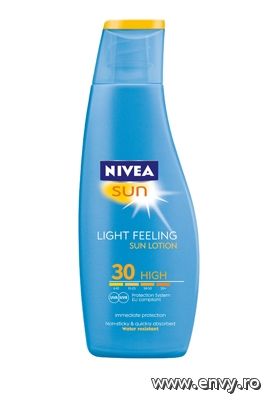Propunere: Nivea Sun Light Feeling FPS 30; te protejeaza imediat ce ai aplicat-o si este rezistenta la apa. Ofera protectie eficienta impotriva arsurilor dar si a imbatranirii premature, pret 33,97 lei.