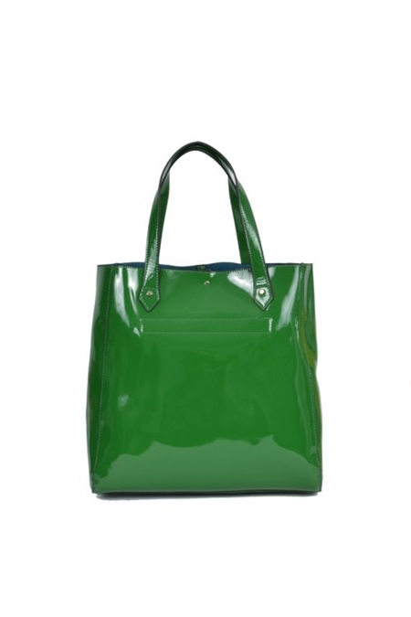 O geanta intr-o culoare vesela, din material lucios. Poate fi purtata pe umar sau tinuta de cele doua barete mai mici.