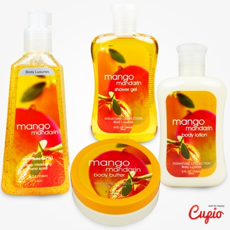 Kit-ul Mango Mandarine contine crema de corp, gel de dus, unt de corp, sapun lichid.