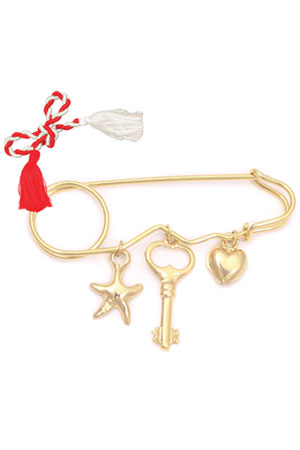 O brosa in stil lucky charm va bucura orice femeie, cu ocazia zilei de 1 Martie!Brosa metalica, in forma de ac de siguranta, de la Meli Melo, 4,99 lei. Brosa are trei pandantive, in forma de inimioara, stea si cheita.