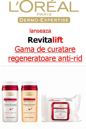 Gama anti-rid numarul 1 in lume, expertul Revitalift de la L'Oreal in ingrijirea anti-imbatranire si fermitate, va invita sa descoperiti noua gama de curatare regeneratoare, formata din lapte demachiant, lotiune tonica, servetele demachiante.Redati vitalitatea tenului dumneavoastra si ramaneti tanara luptand contra celor 3 semnale ale imbatranirii cu 3 ingrediente active!