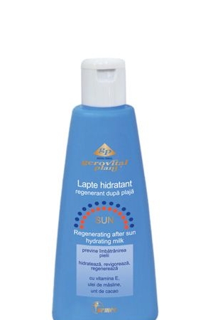 Lapte hidratant regenerant dupa plaja de la Gerovital PlantLaptele hidratant regenerant dupa plaja este un produs cu textura usoara, care hidrateaza pielea expusa la soare si ii reda senzatia de confort. Produsul contine vitamina E, ulei de masline, unt de cacao si ceara de albine, cu rol in diminuarea efectelor negative ale razelor solare si regenerarea pielii.
