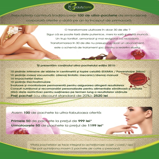 Ei bine, centrul de rasfat Beautyferia s-a gandit ca meriti sa te bucuri din plin de trupul tau si de ce nu, si de admiratia celor din jurul tau.