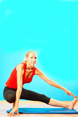 Stai cu picioarele fandate, indoaie un picior si intinde-l pe celalalt. Atinge cu mana corespondenta piciorul intins. Schimba piciorul si repeta, pentru fiecare, de 15 ori. Acesta este un exercitiu excelent pentru tonifierea muschilor de la picioare.