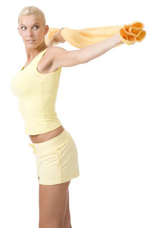 Ia prosopul mare, tine-l cu ambele maini sus, in spate si trage puternic de el. Executa in seturi 3 x 10. Acest exercitiu iti va tonifia zona pieptului si bratele.