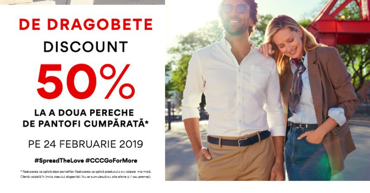 Dacă ieși cu partenerul sau partenera la cumpărături, vino și la magazinul CCC din Mega Mall! Primești un discount de 50% la a doua pereche de pantofi cumpărată pentru jumătatea ta