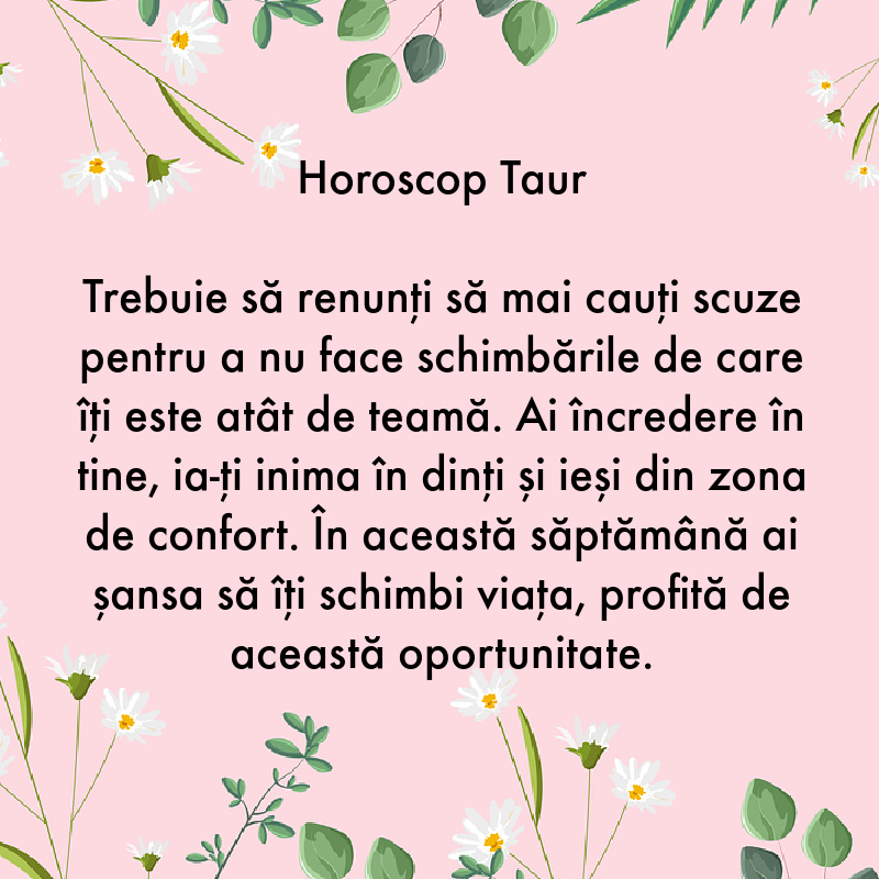 Trebuie să renunți să mai cauți scuze pentru a nu face schimbările de care îți este atât de teamă. Ai încredere în tine, ia-ți inima în dinți și ieși din zona de confort. În această săptămână ai șansa să îți schimbi viața, profită de această oportunitate.
