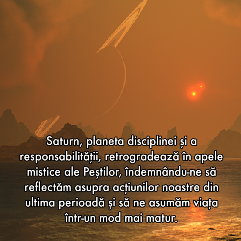 Saturn, planeta disciplinei și a responsabilității, retrogradează în apele mistice ale Peștilor, îndemnându-ne să reflectăm asupra acțiunilor noastre din ultima perioadă și să ne asumăm viața într-un mod mai matur.
