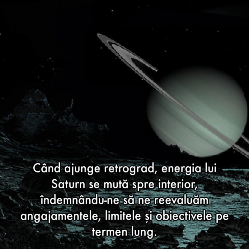 Saturn, cunoscut și ca stăpânul zodiacului, guvernează disciplina, karma, responsabilitatea și ordinea. Când ajunge retrograd, energia lui Saturn se mută spre interior, îndemnându-ne să ne reevaluăm angajamentele, limitele și obiectivele pe termen lung. Retrogradele sunt momente oportune pentru introspecție și reconectare cu eul nostru interior.