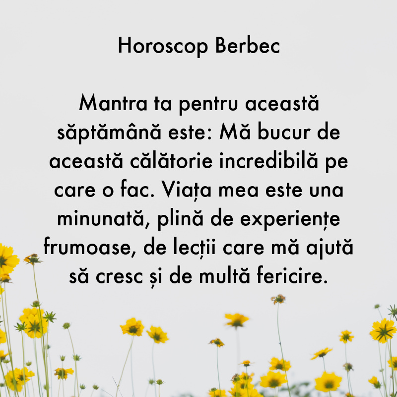 Mantra ta pentru această săptămână este: Mă bucur de această călătorie incredibilă pe care o fac. Viața mea este una minunată, plină de experiențe frumoase, de lecții care mă ajută să cresc și de multă fericire.