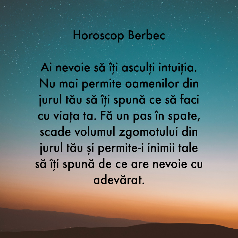 Ai nevoie să îți asculți intuiția. Nu mai permite oamenilor din jurul tău să îți spună ce să faci cu viața ta. Fă un pas în spate, scade volumul zgomotului din jurul tău și permite-i inimii tale să îți spună de ce are nevoie cu adevărat.
